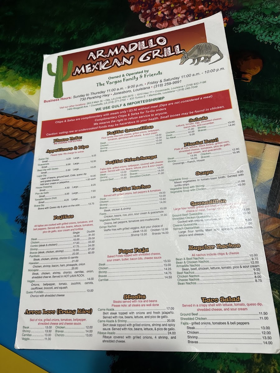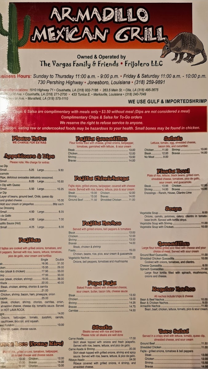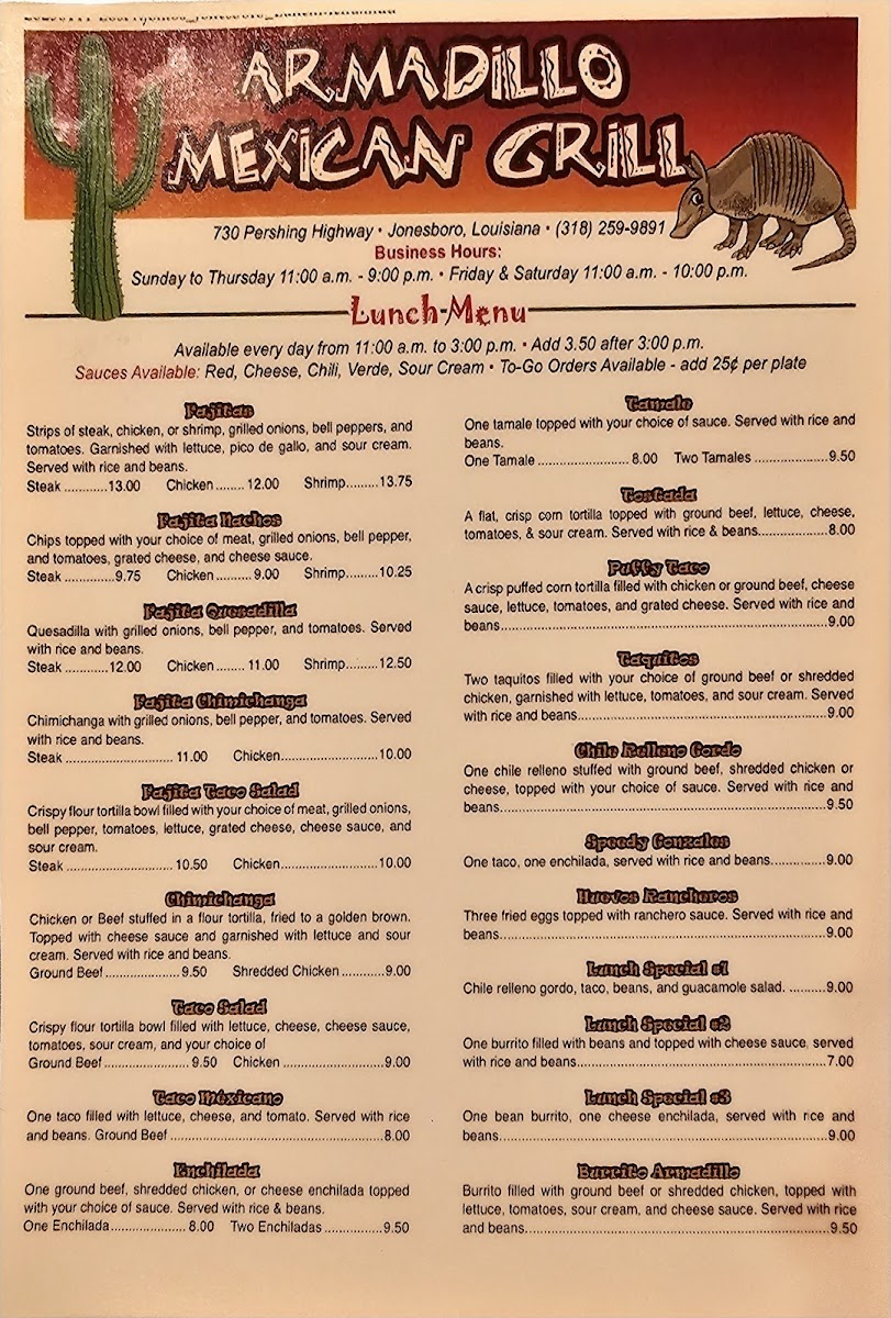 If you're looking for a place to enjoy some flavorful comfort food, El Armadillo Grill Menu is where you’ll want to be. Located on Pershing Highway in Jonesboro, LA, this cozy spot offers a variety of dishes perfect for every palate. Whether you’re in the mood for a hearty meal or something lighter, their menu has it all-from sizzling fajitas to mouthwatering burgers. Each dish is made with fresh ingredients, ensuring every bite is full of flavor. And don’t forget to try their famous sides; they perfectly complement any main dish. Whether you’re grabbing a quick lunch or sitting down for a relaxed dinner, you’ll find something that hits the spot. With such a wide selection, it's impossible not to find your new favorite dish here.